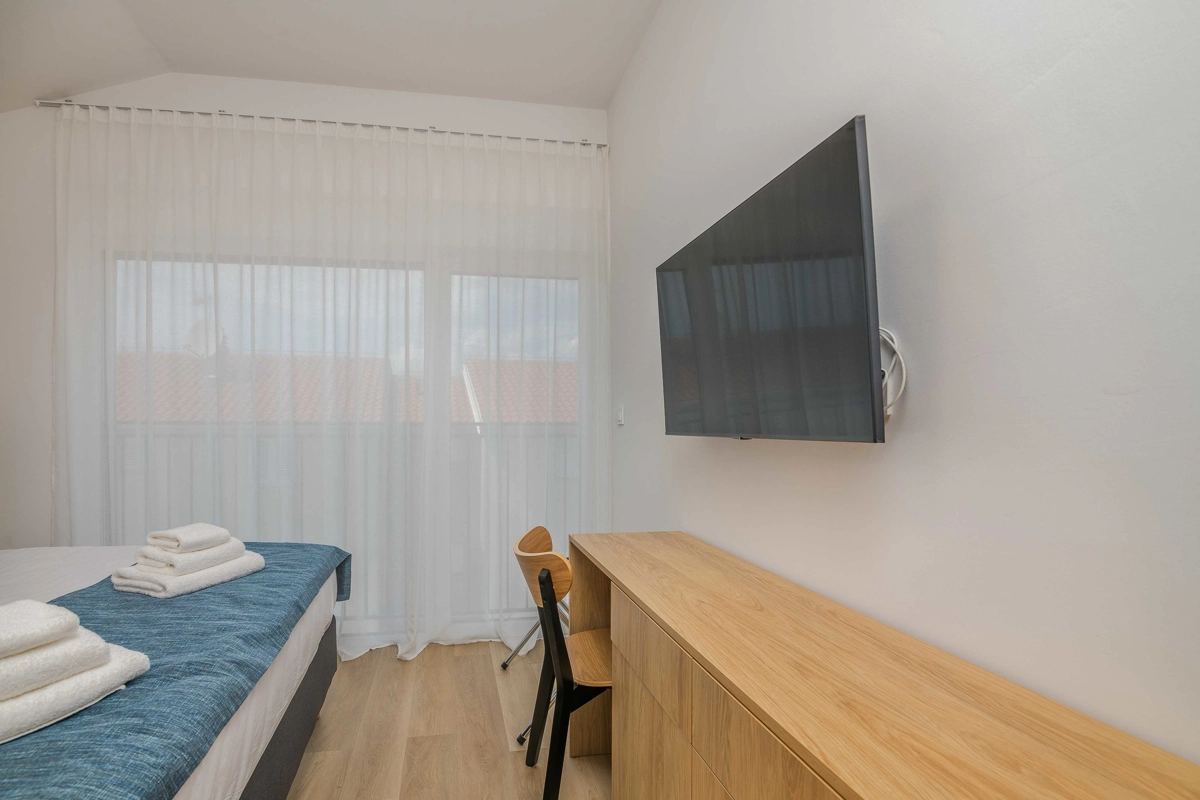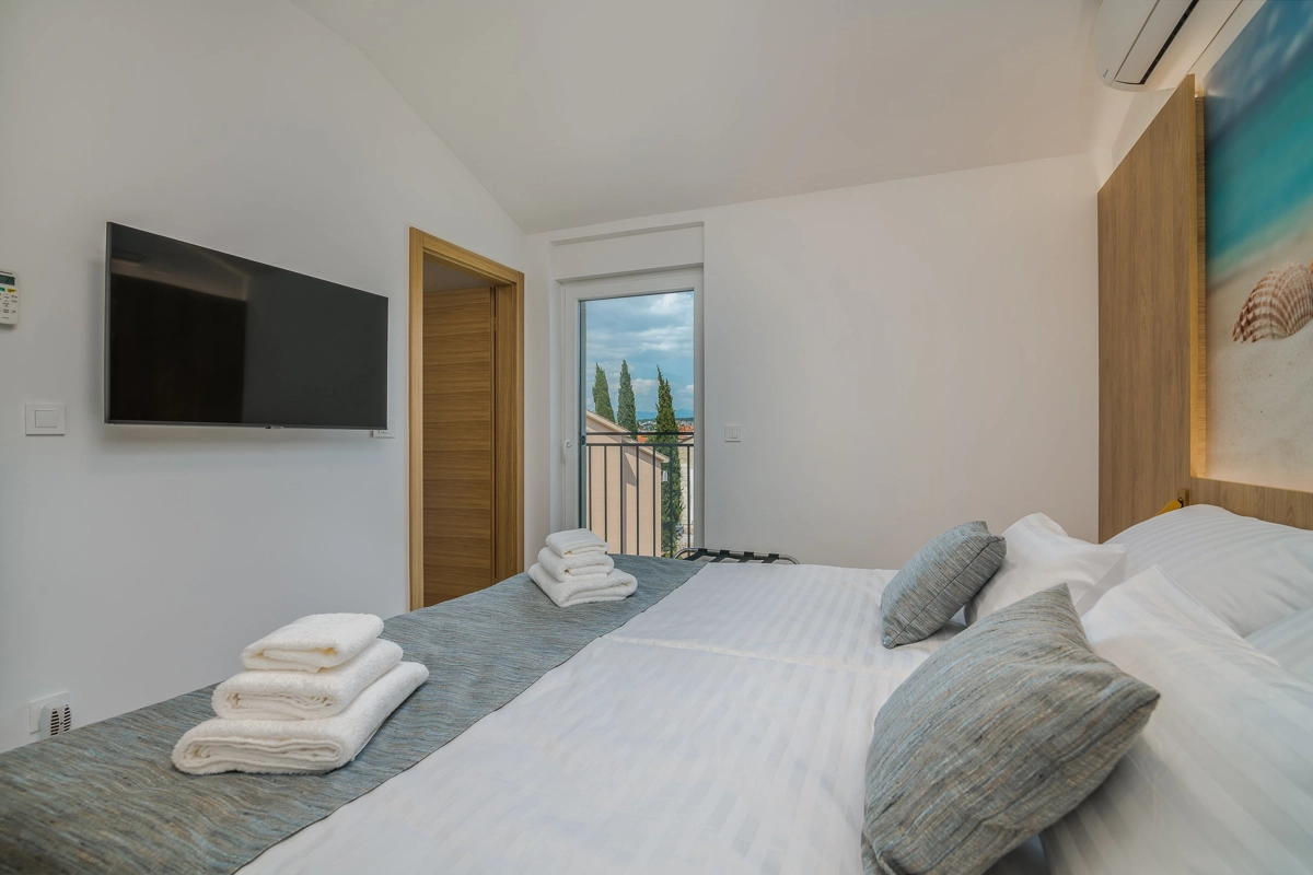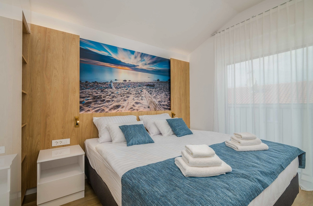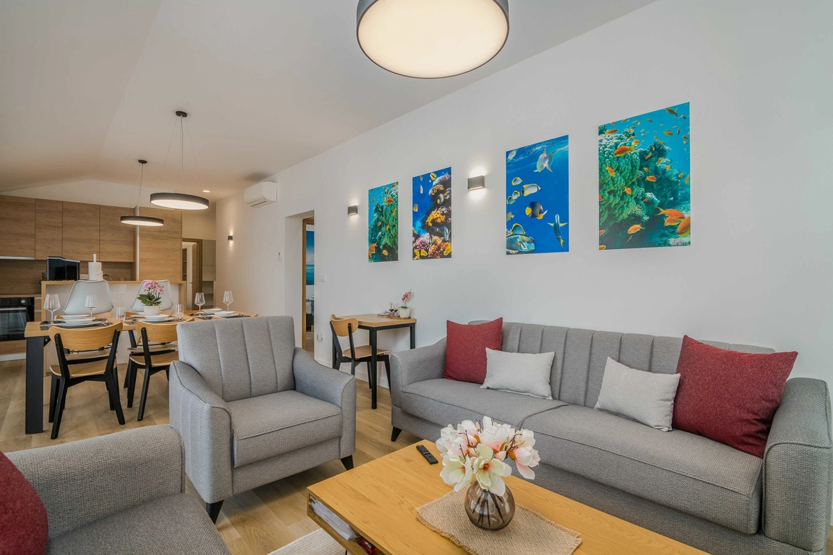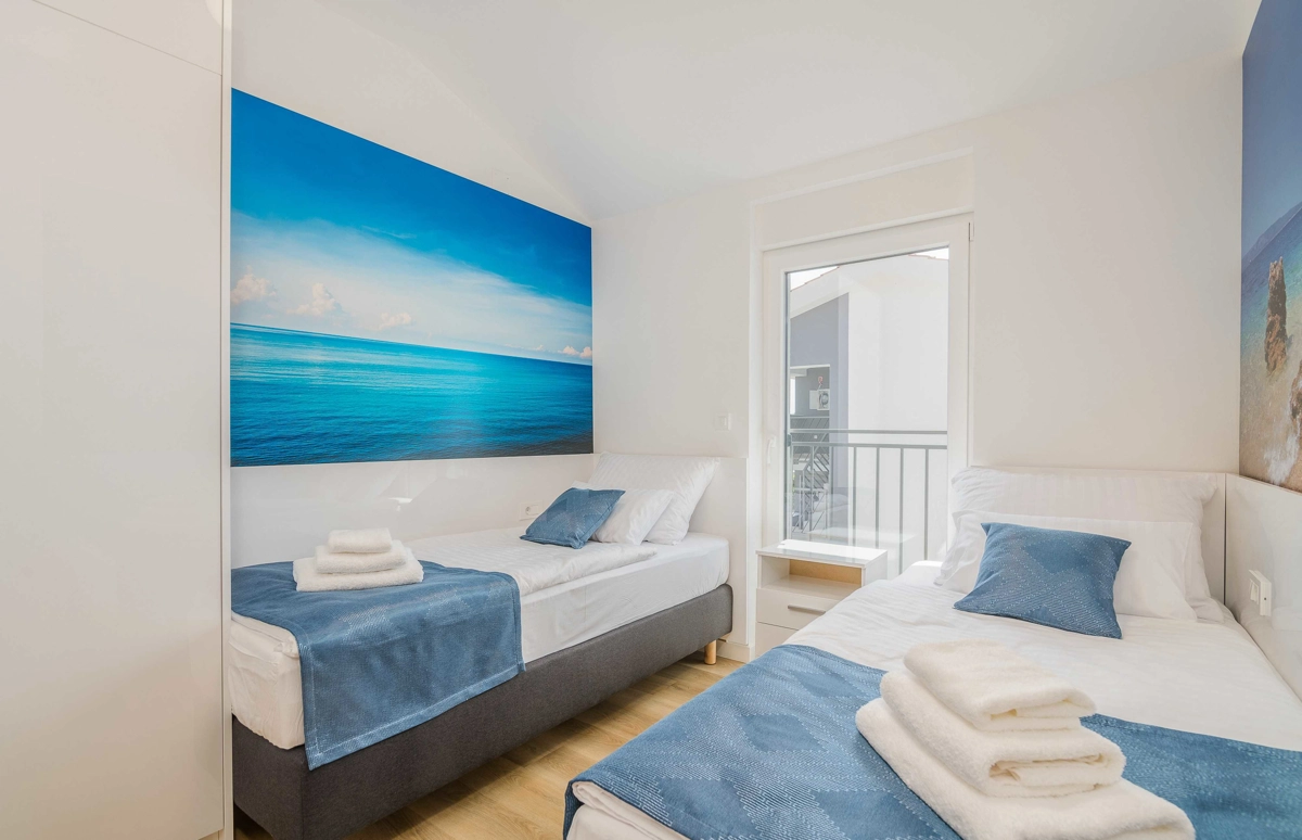 Ovaj prekrasan moderan trosoban stan nalazi se na drugom katu stambene zgrade. Svojim gostima nudi prostranu terasu s pogledom na more, što ga čini idealnim za druženje i uživanje u toplim ljetnim danima uz čašu omiljenog pića i roštilj. Sastoji se od dnevnog boravka, dvije spavaće sobe sa bračnim krevetom i jedne sobe sa dva odvojena kreveta, potpuno opremljene kuhinje (posuđe, štednjak, pećnica, hladnjak sa zamrzivačem, aparat za kavu i kuhalo za vodu) i dvije kupaonice. jedan wc, TV, Wi-Fi i klima uređaj dostupni su u apartmanu.
