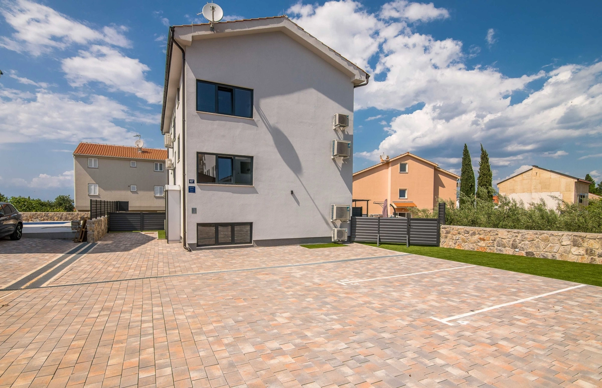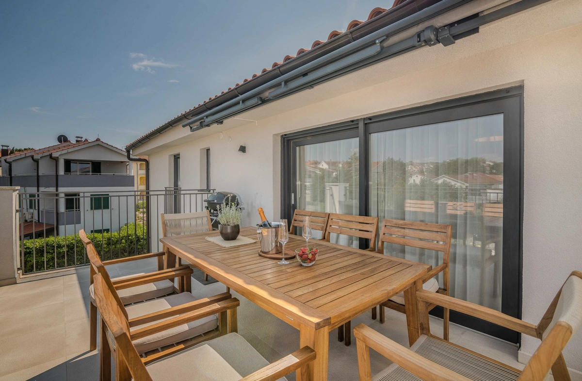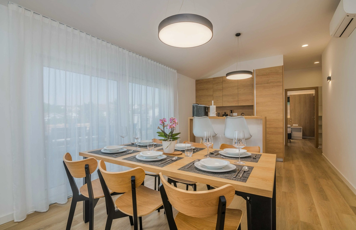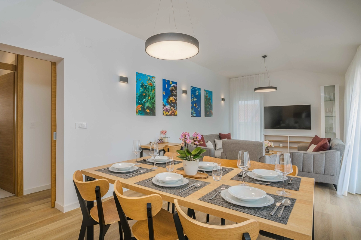 Ovaj prekrasan moderan trosoban stan nalazi se na drugom katu stambene zgrade. Svojim gostima nudi prostranu terasu s pogledom na more, što ga čini idealnim za druženje i uživanje u toplim ljetnim danima uz čašu omiljenog pića i roštilj. Sastoji se od dnevnog boravka, dvije spavaće sobe sa bračnim krevetom i jedne sobe sa dva odvojena kreveta, potpuno opremljene kuhinje (posuđe, štednjak, pećnica, hladnjak sa zamrzivačem, aparat za kavu i kuhalo za vodu) i dvije kupaonice. jedan wc, TV, Wi-Fi i klima uređaj dostupni su u apartmanu.