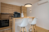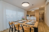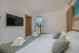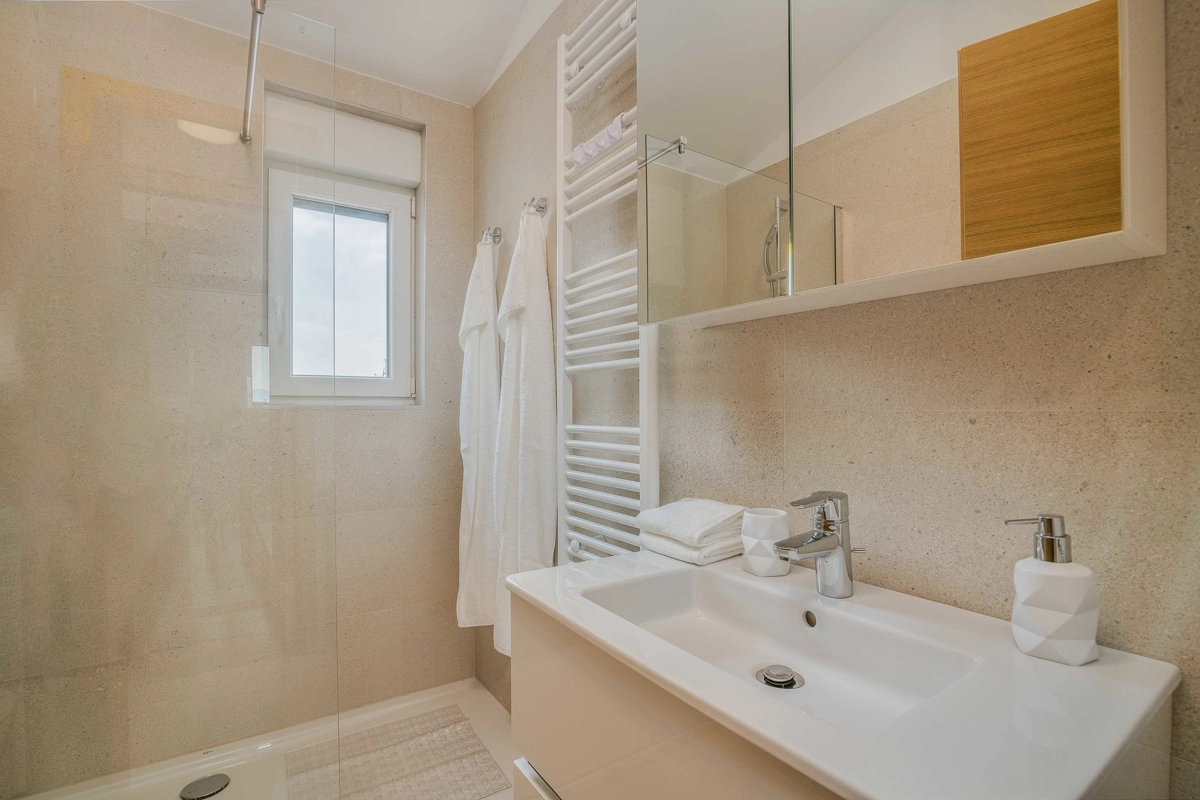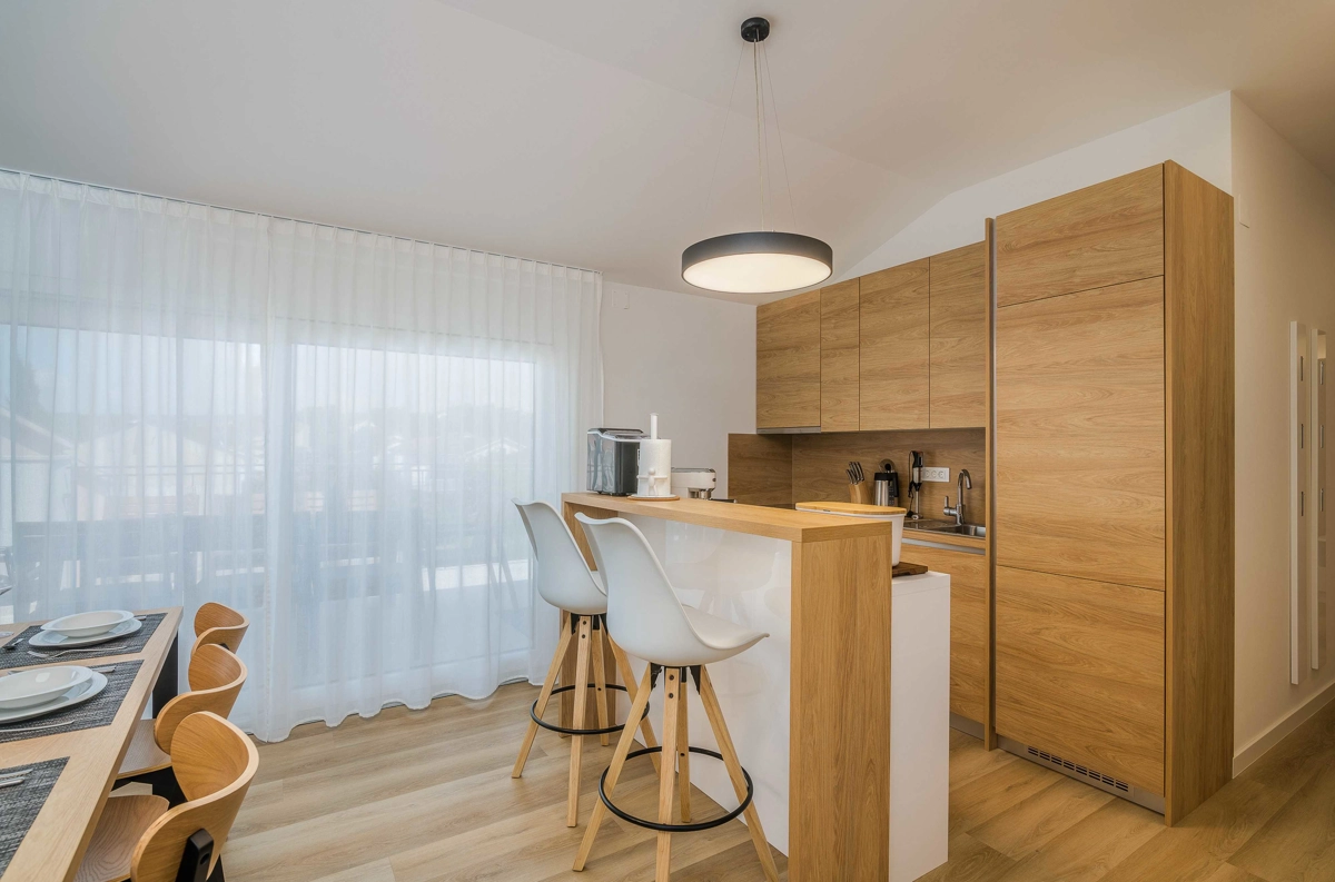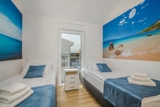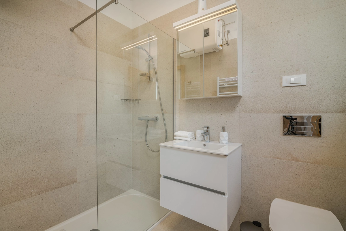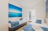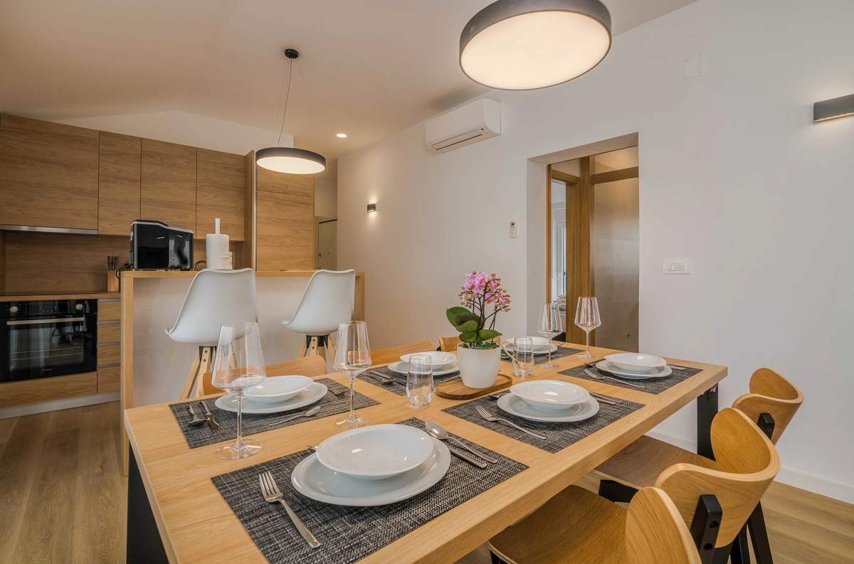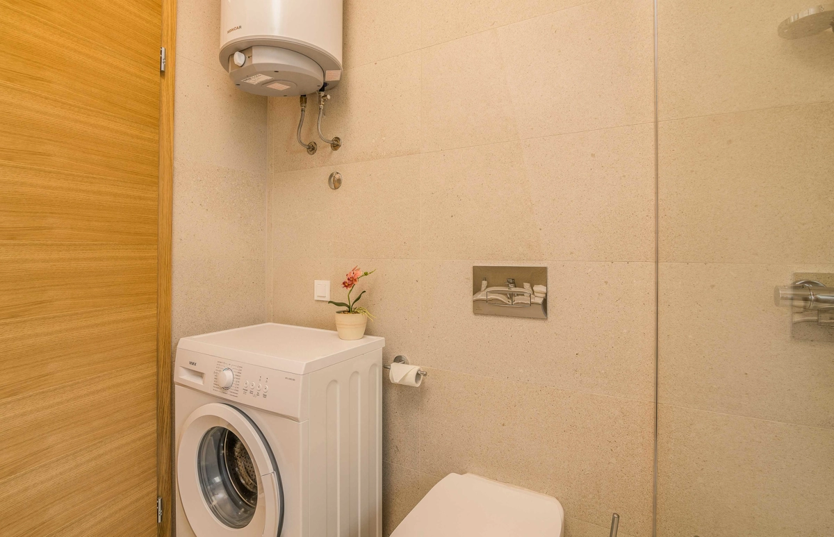 Ovaj prekrasan moderan trosoban stan nalazi se na drugom katu stambene zgrade. Svojim gostima nudi prostranu terasu s pogledom na more, što ga čini idealnim za druženje i uživanje u toplim ljetnim danima uz čašu omiljenog pića i roštilj. Sastoji se od dnevnog boravka, dvije spavaće sobe sa bračnim krevetom i jedne sobe sa dva odvojena kreveta, potpuno opremljene kuhinje (posuđe, štednjak, pećnica, hladnjak sa zamrzivačem, aparat za kavu i kuhalo za vodu) i dvije kupaonice. jedan wc, TV, Wi-Fi i klima uređaj dostupni su u apartmanu.