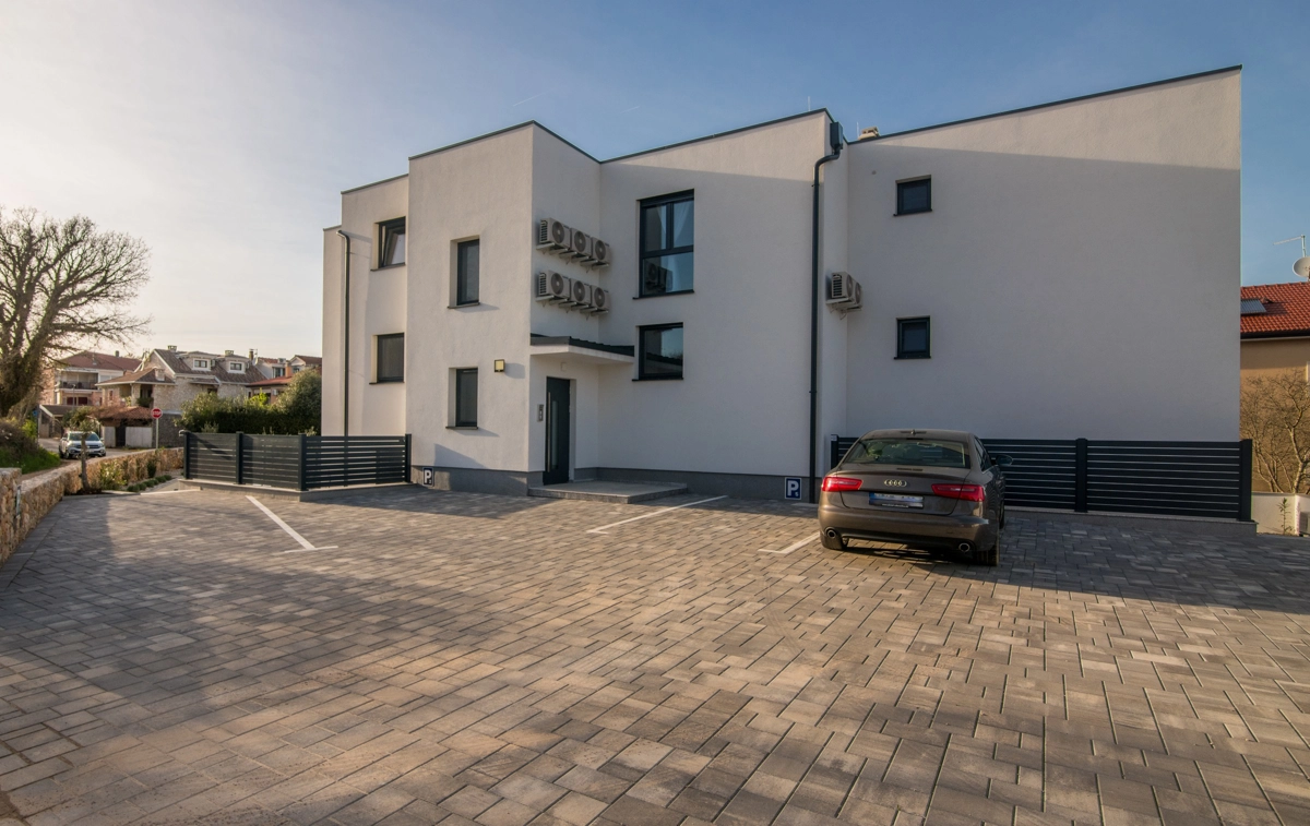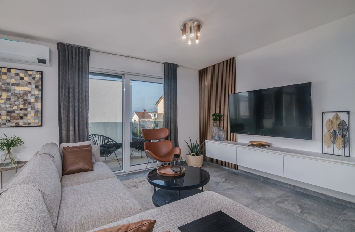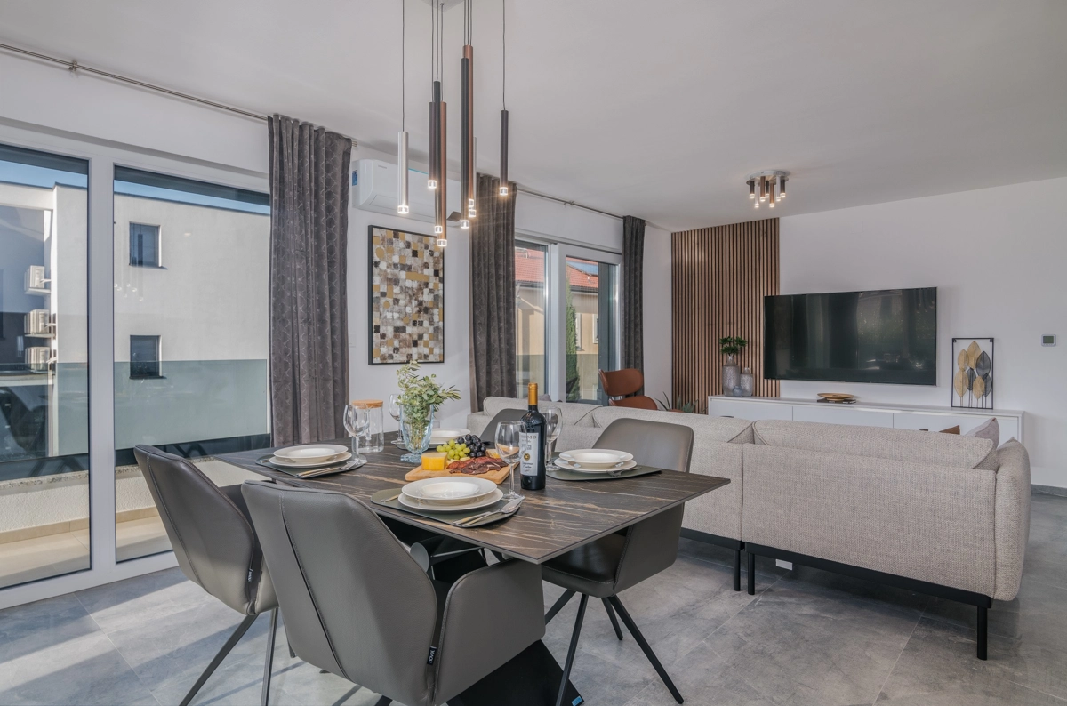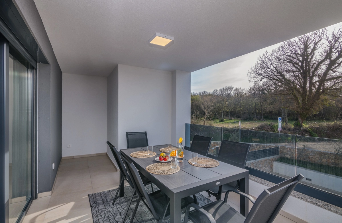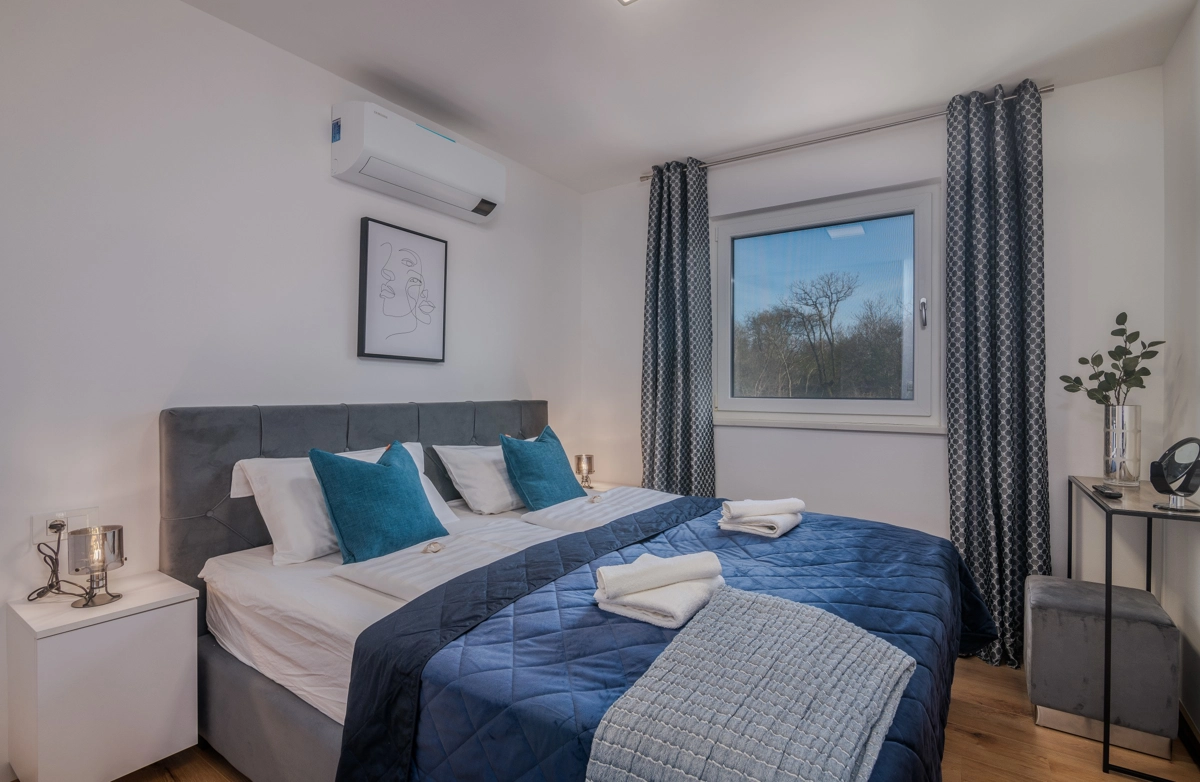 Stan se nalazi na prvom katu stambene zgrade. Apartman ima besplatni WiFi, potpuno opremljenu kuhinju, satelitsku i smart televiziju, klima uređaj te besplatno parkiralište. Sa balkona se pruža lijep pogled na obližnju šumu i okolicu. Apartman se sastoji od dnevnog boravka s blagovaonicom i kuhinjom, dvije udobne spavaće sobe s bračnim krevetima (od kojih jedna ima vlastitu kupaonicu), dodatne kupaonice s wc-om i tušem te lijepe terase na koju se izlazi iz dnevnog boravka. Obje spavaće sobe imaju ormare i klima uređaje.