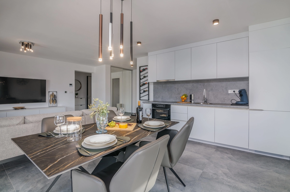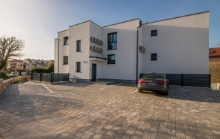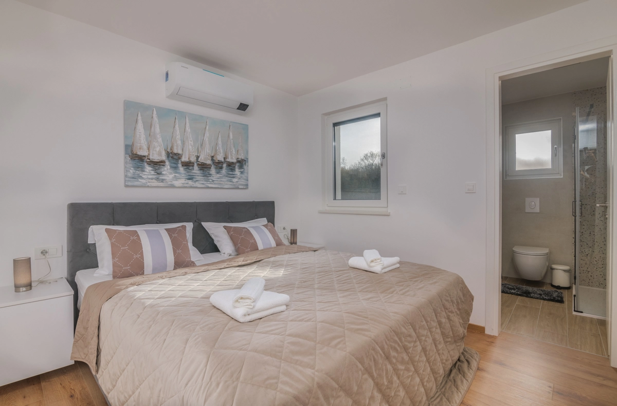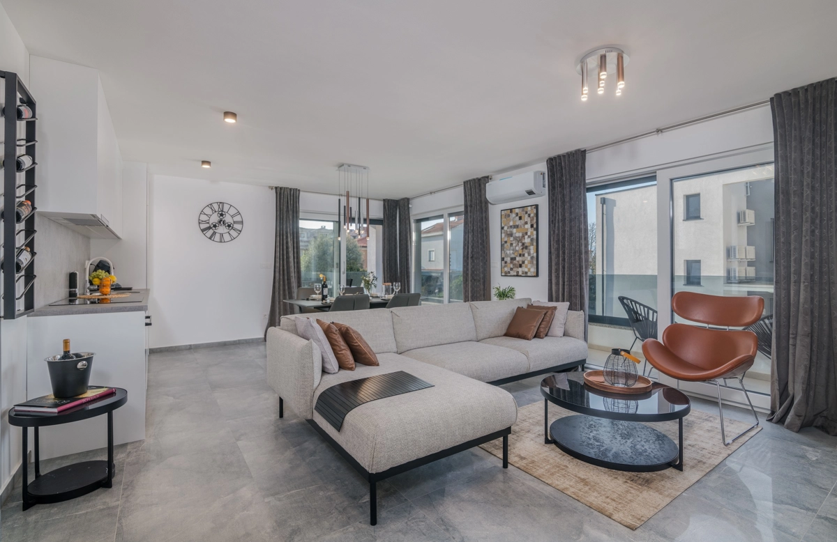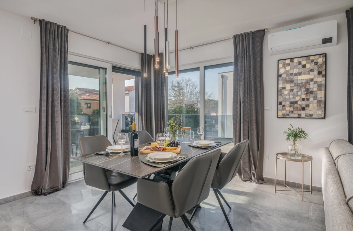 Stan se nalazi na prvom katu stambene zgrade. Apartman ima besplatni WiFi, potpuno opremljenu kuhinju, satelitsku i smart televiziju, klima uređaj te besplatno parkiralište. Sa balkona se pruža lijep pogled na obližnju šumu i okolicu. Apartman se sastoji od dnevnog boravka s blagovaonicom i kuhinjom, dvije udobne spavaće sobe s bračnim krevetima (od kojih jedna ima vlastitu kupaonicu), dodatne kupaonice s wc-om i tušem te lijepe terase na koju se izlazi iz dnevnog boravka. Obje spavaće sobe imaju ormare i klima uređaje.