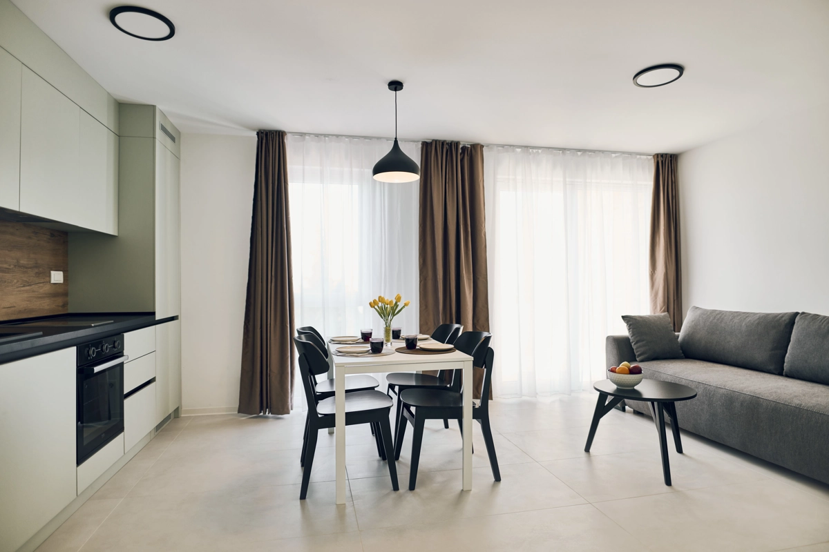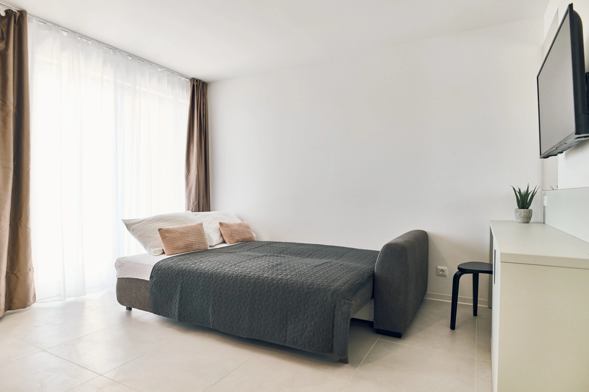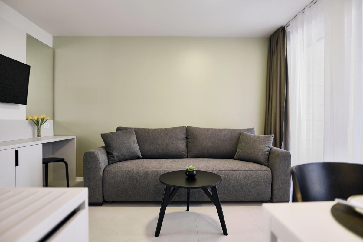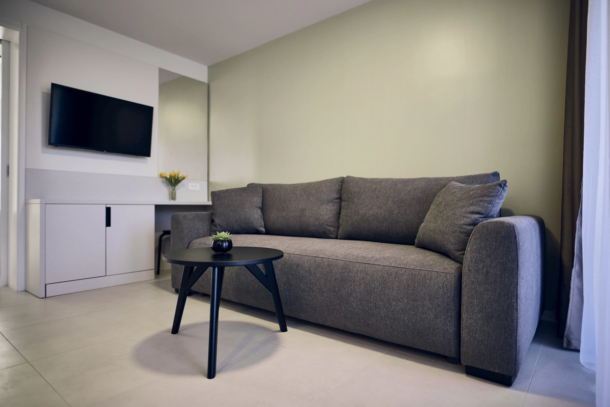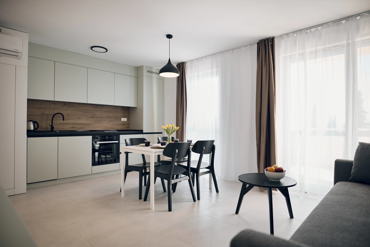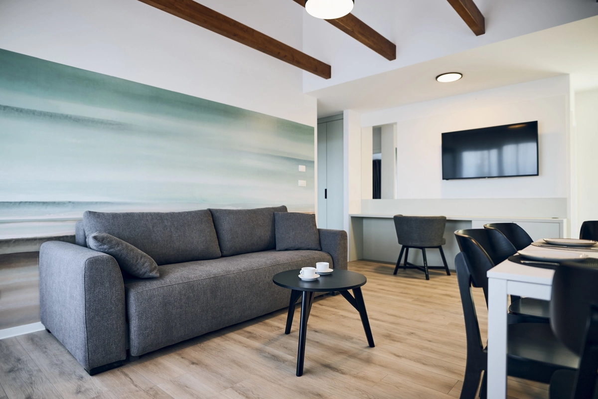They are characterized by soft pastel colors, modern furniture, plenty of daylight and a spacious balcony or terrace with a view of the pine forest or the mountains. Each apartment is air-conditioned and consists of one or more bedrooms, a bathroom with a shower cabin and a washing machine, a living room with a comfortable couch for an additional 2 people, a dining room and a functional kitchen equipped with a refrigerator. with freezer, dishwasher, oven, electric stove, kettle and basic cooking utensils.