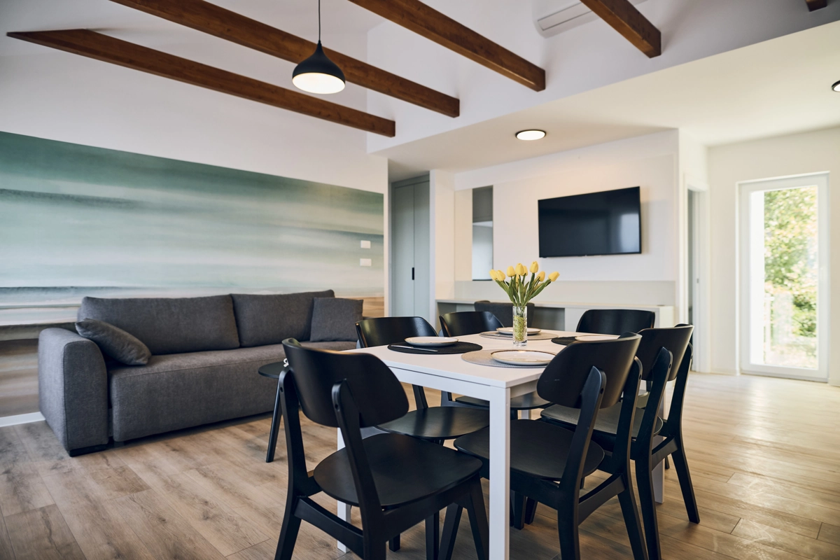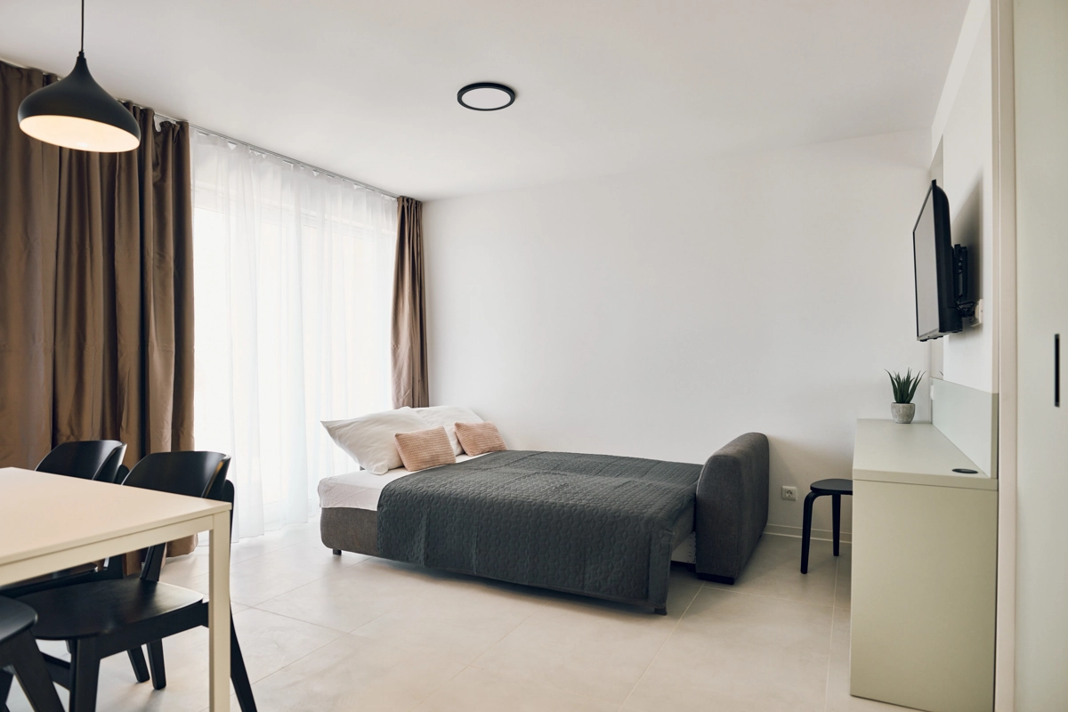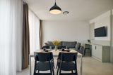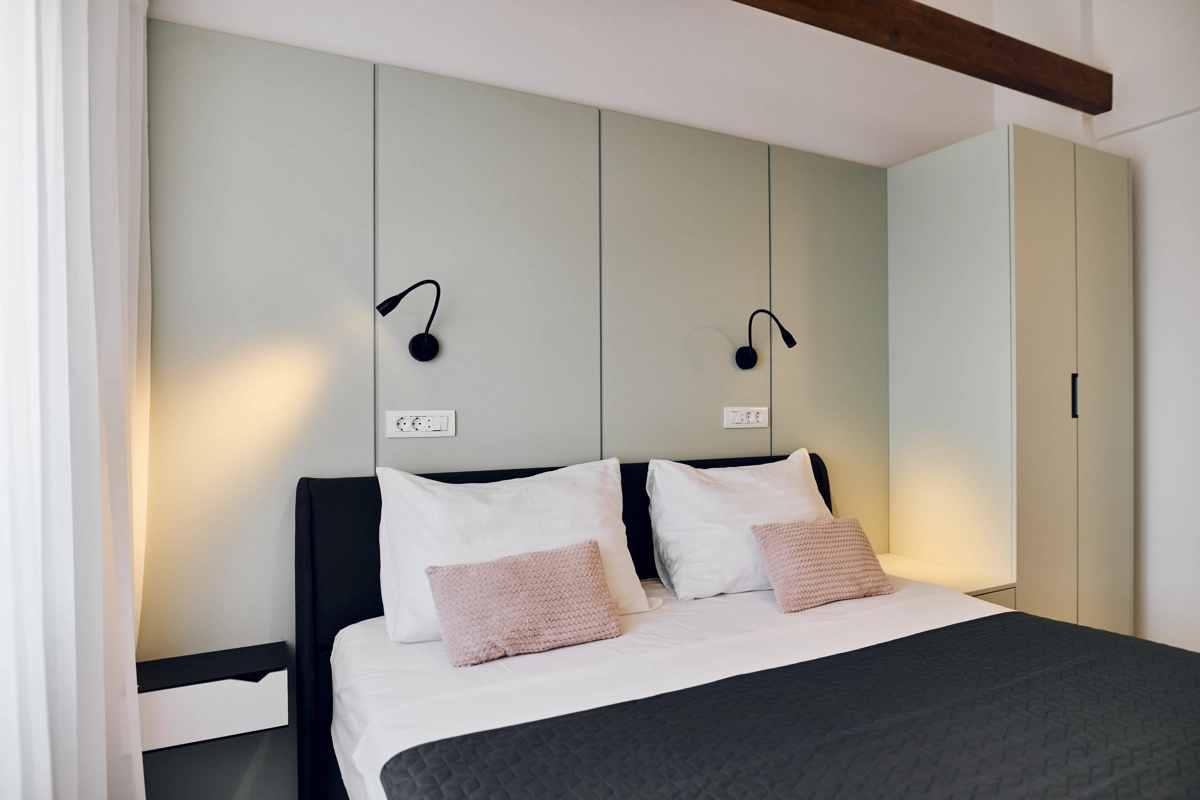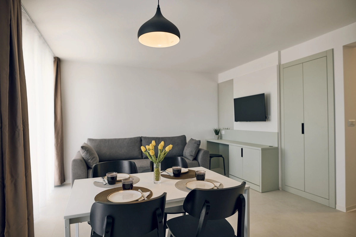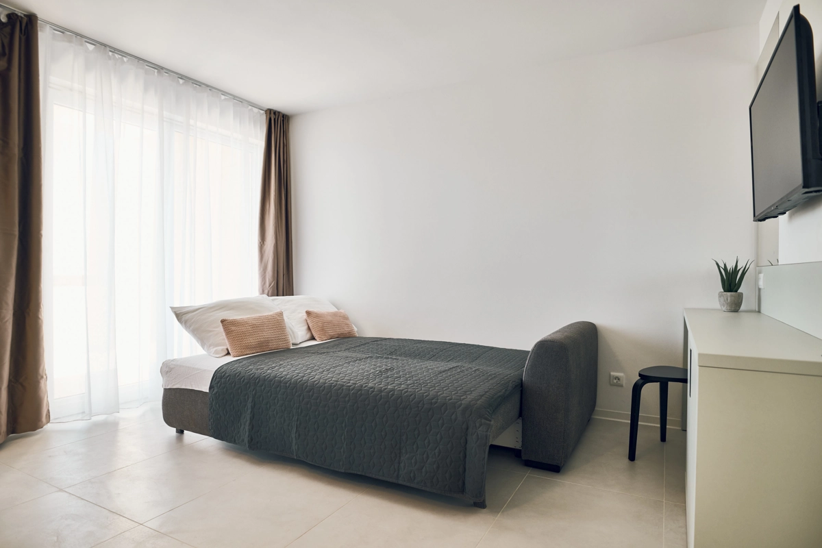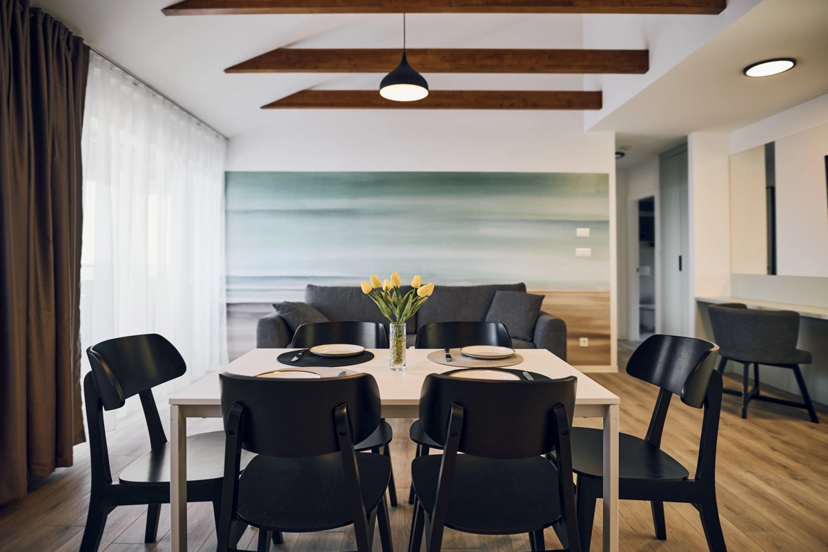 They are characterized by soft pastel colors, modern furniture, plenty of daylight and a spacious balcony or terrace with a view of the pine forest or the mountains. Each apartment is air-conditioned and consists of one or more bedrooms, a bathroom with a shower cabin and a washing machine, a living room with a comfortable couch for an additional 2 people, a dining room and a functional kitchen equipped with a refrigerator. with freezer, dishwasher, oven, electric stove, kettle and basic cooking utensils.