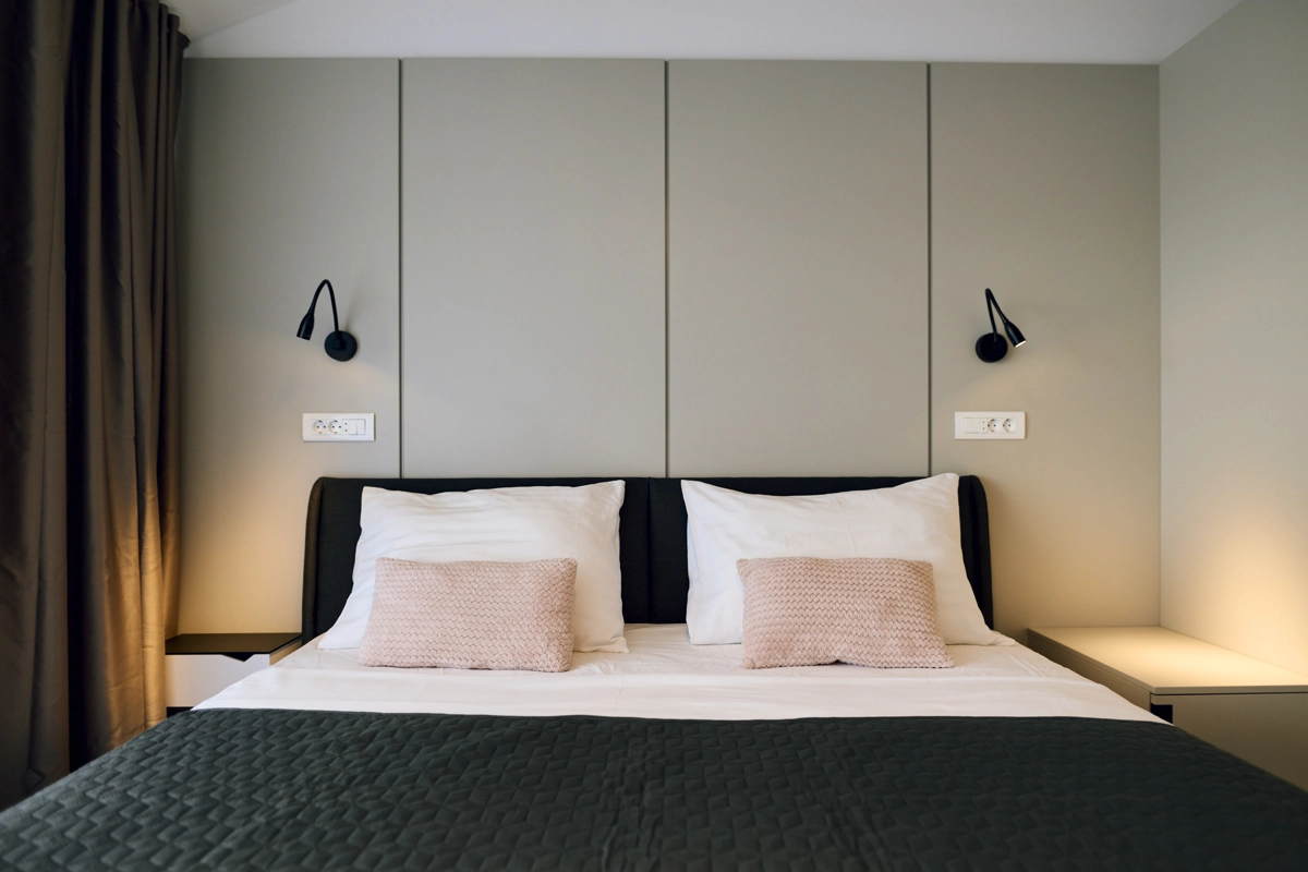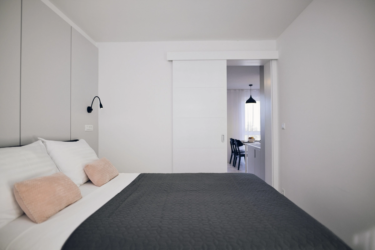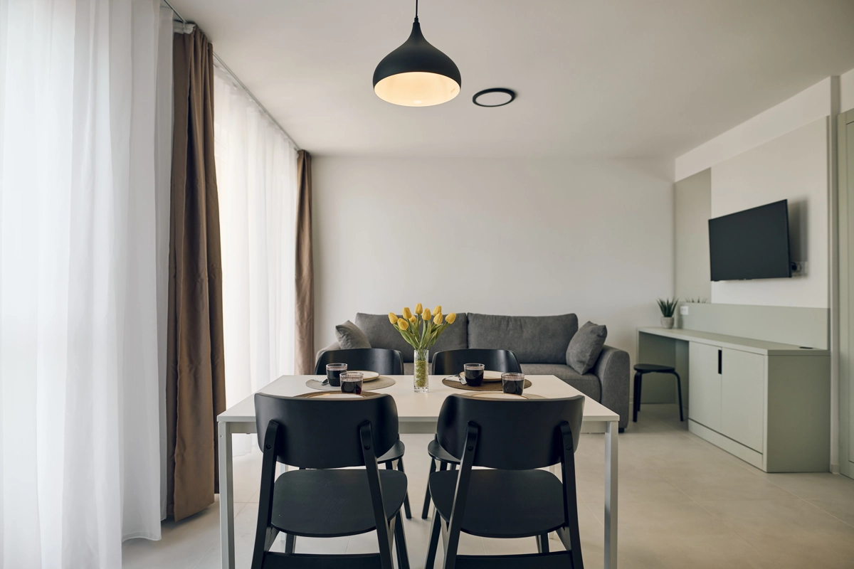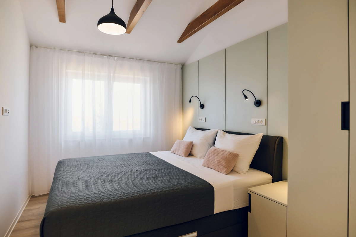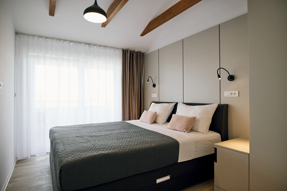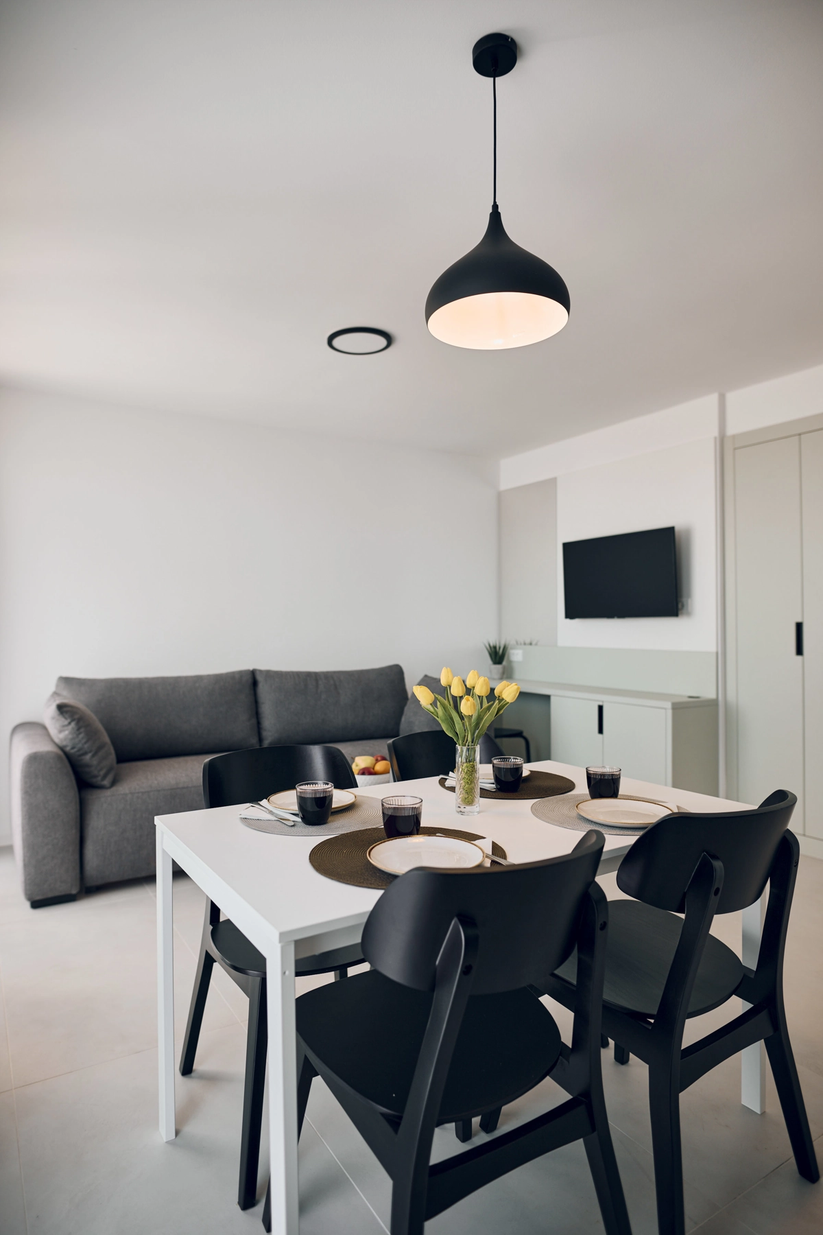 They are characterized by soft pastel colors, modern furniture, plenty of daylight and a spacious balcony or terrace with a view of the pine forest or the mountains. Each apartment is air-conditioned and consists of one or more bedrooms, a bathroom with a shower cabin and a washing machine, a living room with a comfortable couch for an additional 2 people, a dining room and a functional kitchen equipped with a refrigerator. with freezer, dishwasher, oven, electric stove, kettle and basic cooking utensils.